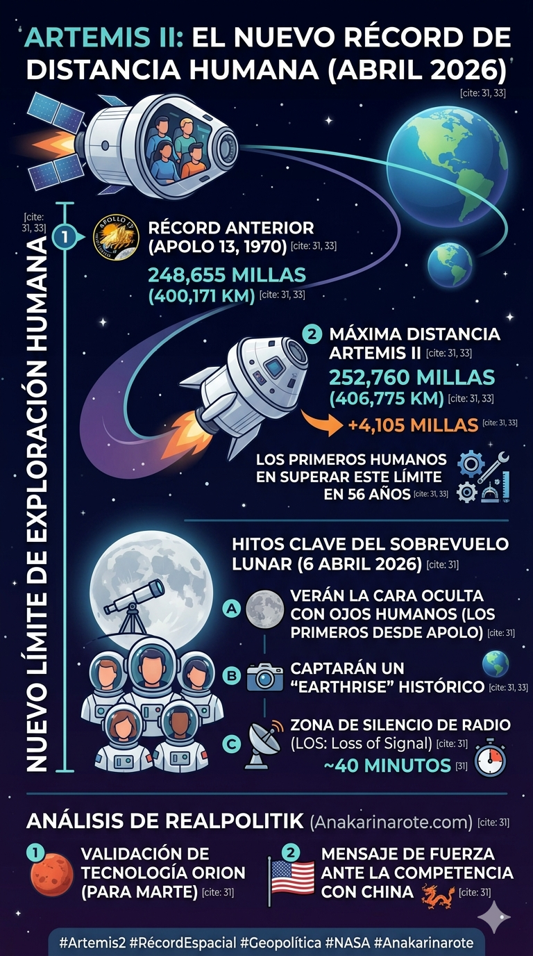 Este lunes 6 de abril de 2026, la misión Artemis II ha ejecutado el "vuelco" más importante de la exploración espacial del siglo XXI. Alrededor de las 1:56 p. m. (EDT), la cápsula Orion pulverizó el récord de distancia desde la Tierra establecido hace 56 años por la accidentada misión Apolo 13. Por primera vez desde 1970, cuatro seres humanos se encuentran en el punto más alejado de nuestro planeta, preparándose para un sobrevuelo lunar que marca el fin de la hegemonía de la órbita baja.