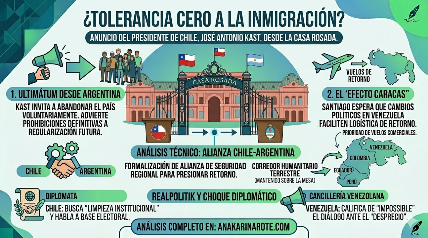 Kast utiliza la sintonía política con Javier Milei para proyectar una imagen de "limpieza institucional" en el Cono Sur. Sin embargo, la efectividad de las expulsiones masivas sigue supeditada a la capacidad operativa de los vuelos y a la incierta estabilidad política de la Venezuela post-Maduro.