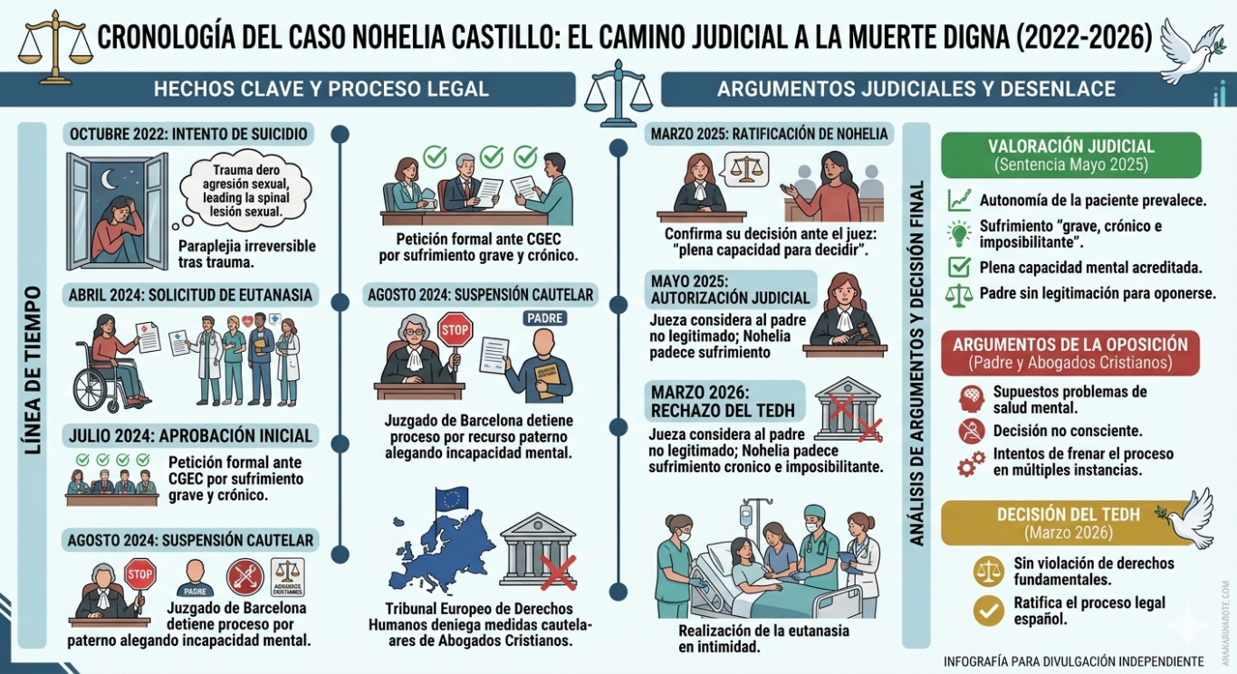 Este jueves 26 de marzo de 2026, se lleva a cabo el procedimiento de eutanasia de Noelia Castillo Ramos, la joven de 25 años cuya voluntad de morir desencadenó un histórico y extenuante conflicto jurídico entre el derecho a la autonomía personal y la oposición familiar. Tras 20 meses de litigio, el aval definitivo de la justicia europea cierra uno de los casos más complejos desde la entrada en vigor de la Ley Orgánica de Regulación de la Eutanasia (LORE).