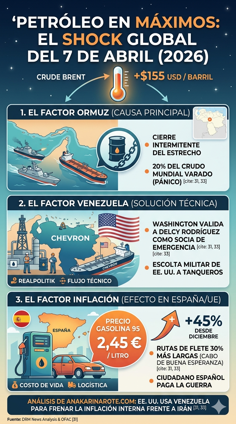El mercado energético global ha entrado en zona de pánico este 7 de abril. Tras un fin de semana de hostilidades latentes en el Medio Oriente, el cierre intermitente del Estrecho de Ormuz ha catapultado el crudo Brent por encima de la barrera psicológica de los $150. Mientras tanto, en Washington, la administración Trump presiona para que la "nueva PDVSA" de la administración de Delcy Rodríguez cubra el déficit que la guerra con Irán ha dejado en las refinerías del Golfo.