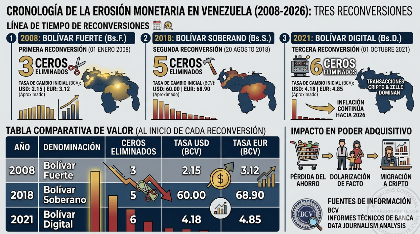 Impacto: si bien simplificó los sistemas contables, no detuvo la dolarización transaccional. El bolívar pasó a ser una moneda de flujo inmediato (pagos de servicios y transporte), mientras que el ahorro se desplazó definitivamente hacia otros activos.
